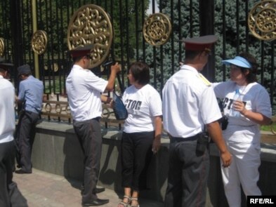 Aziza Abdrasulova, Tolekan Ismailova, Asiya Sasykbaeva, and Gulnara Jurabaeva chained themselves to the fence in front of the building that houses the Kyrgyz government, demanding the immediate release of demonstrators detained by police during the presidential election on July 23.